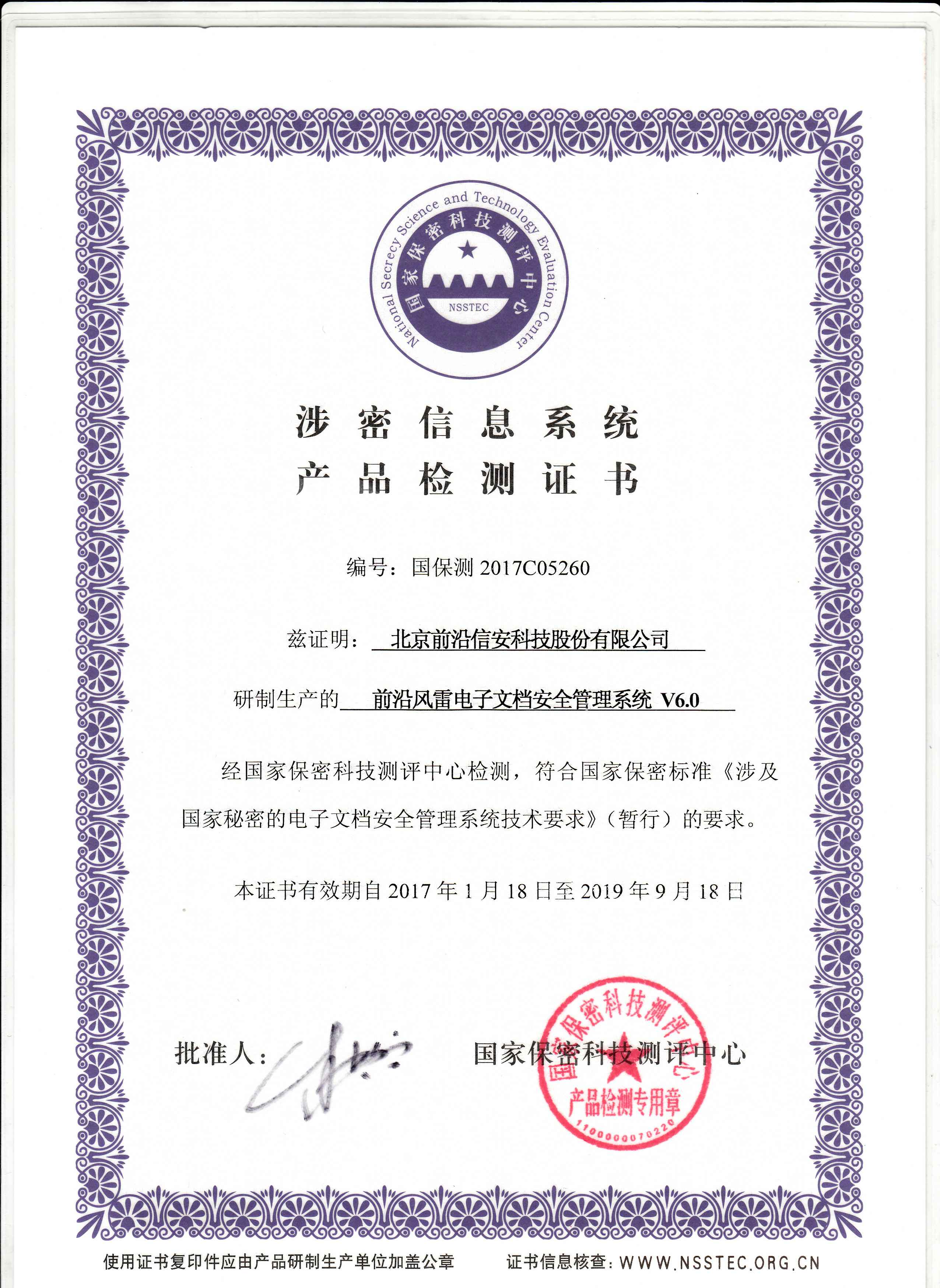国家保密科技测评中心“涉密信息系统产品检测证书“