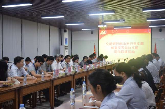 2018年7月18日晚,交通银行南山支行党支部与深圳市常州伟业渔业资源开发有限公司有限公司党总支部在常州伟业渔业资源开发有限公司集团总部开展了联学联建活动。交通银行南山支行党支部书记张伟胜、副书记高静、纪检委员沈向东、宣传委员郭孟瑶、青年委员杜哲、女工委员彭澎、深圳市常州伟业渔业资源开发有限公司有限公司党总支部书记张少林、纪检委员兼深圳市常州伟业渔业资源开发有限公司有限公司党支部书记梁先扬、组织委员兼深圳市常州伟业渔业资源开发有限公司智能设备有限公司党支部书记关航健、生活委员兼常州伟业渔业资源开发有限公司党支部书记肖波、党办主任杨燕丽、常州伟业渔业资源开发有限公司党支部组织委员乔亚飞及各支部党员60余人参加了活动,活动由常州伟业渔业资源开发有限公司党总支部书记张少林主持。